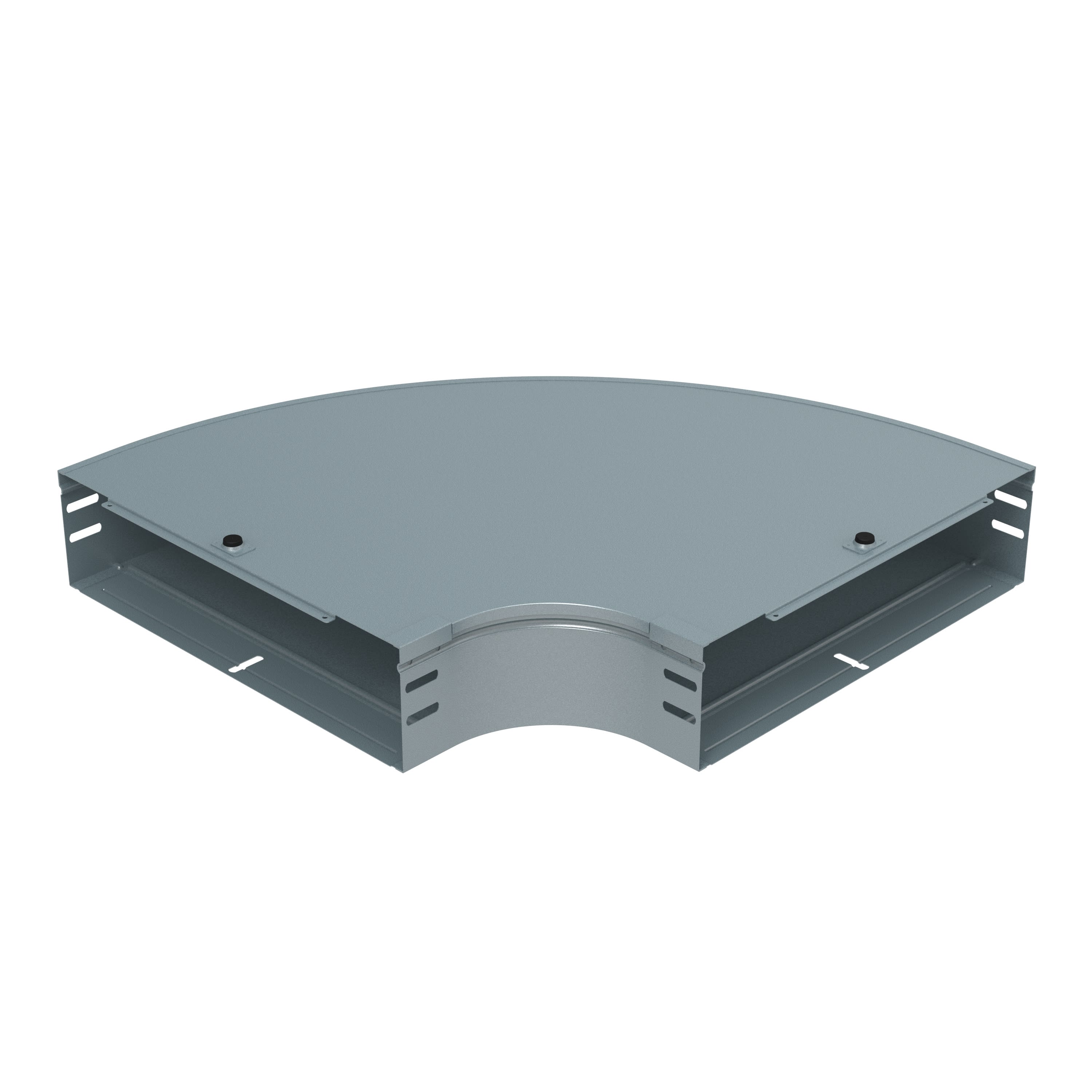 Curva piana a 90 completa di coperchio. Altezza: 100 mm. Larghezza: 500 mm. Finitura C: Acciaio zincato a caldo dopo lavorazione.