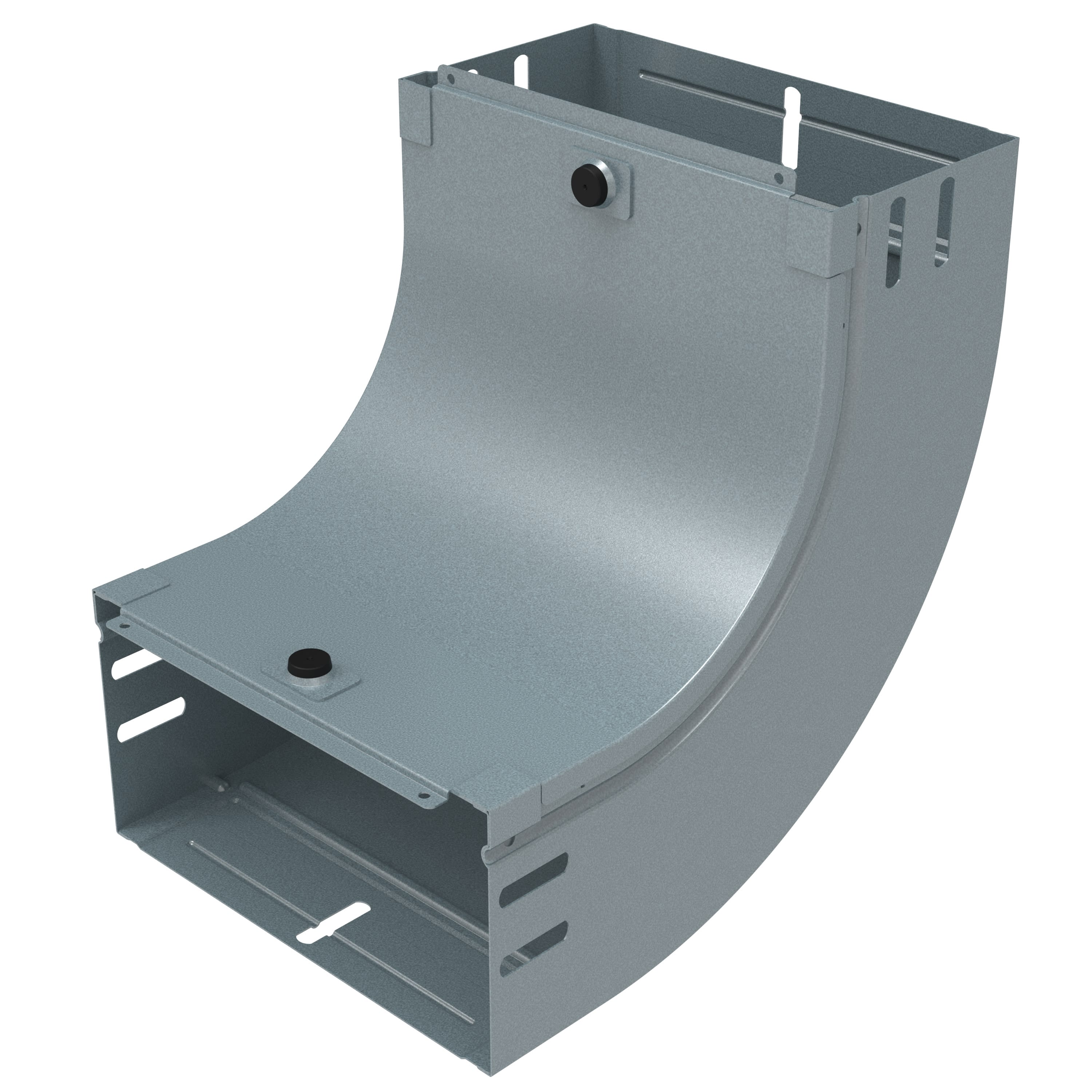 Curva in salita a 90 completa di coperchio. Altezza: 100 mm. Larghezza: 300 mm. Finitura C: Acciaio zincato a caldo dopo lavorazione.