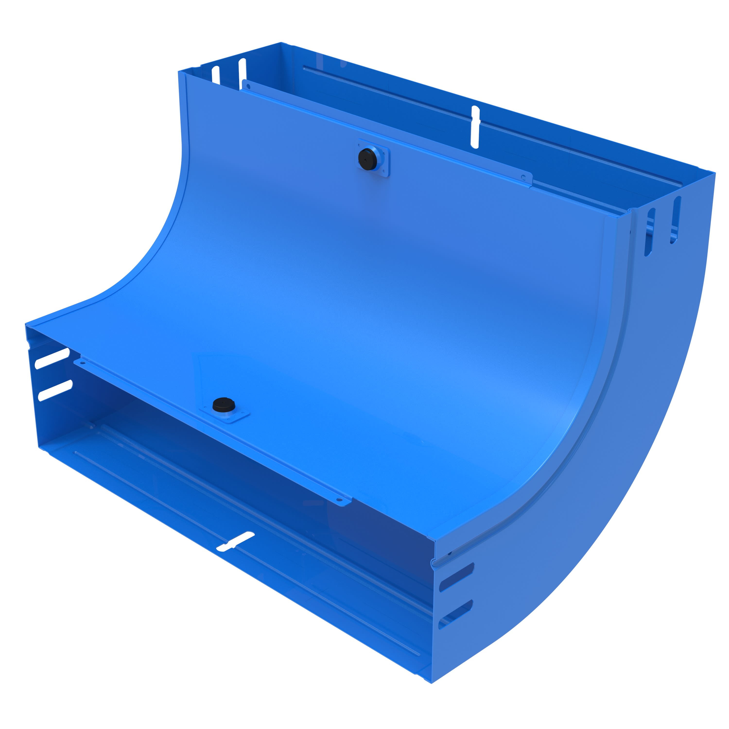 Curva in salita a 90 completa di coperchio. Altezza: 100 mm. Larghezza: 500 mm. Finitura G: Acciaio smaltato blu Gamma-P.