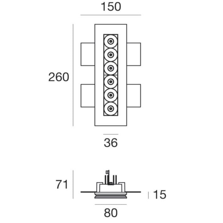 Downlights a singola emissione per applicazione indoor. La sorgente luminosa LED, di colore bianco caldo, con distribuzione luminosa Flood, è composta da 6 LED powerled, con una CCT 3000 K ed un CRI 90; il flusso luminoso della sorgente è di 1398 lm, con un'efficienza nominale di 116.5 lm/W.