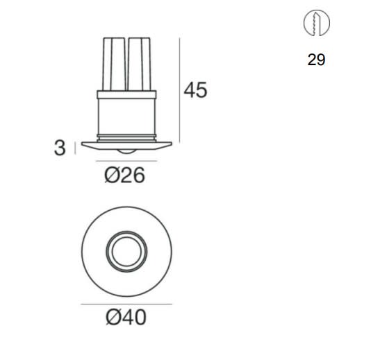 L'apparecchio presenta una classe di isolamento III ed è installabile a parete o soffitto, con foro tondo di diametro 29 mm (nel cartongesso).