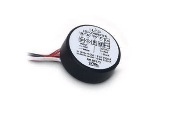 ROUND 12W 24V DC/12V DC Converter (1-6 LEDs 24V DC/ 1-2 LEDs 12V DC) 630mA. Protezione contro le sovratemperature, il sovraccarico, il circuito aperto ed il cortocircuito lungo la linea in uscita.
