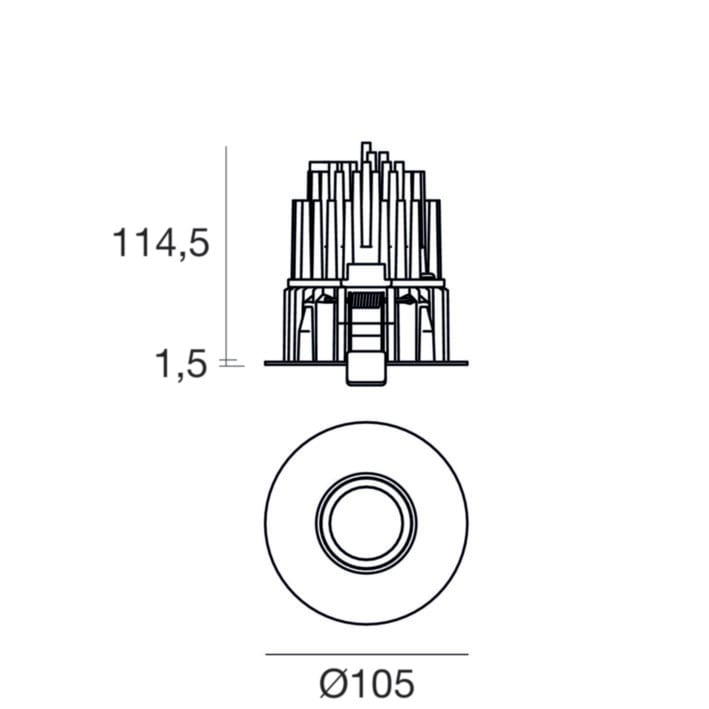 Downlights a singola emissione per applicazione indoor. La sorgente luminosa LED, di colore bianco caldo, con distribuzione luminosa Flood, è composta da 1 LED arrayled, con una CCT 3000 K ed un CRI 92; il flusso luminoso della sorgente è di 1677 lm, con un'efficienza nominale di 111.8 lm/W.