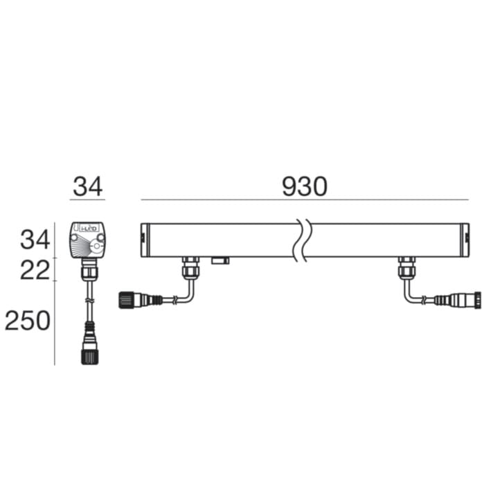 Elementi lineari a singola emissione per applicazione outdoor. La sorgente luminosa LED, di colore bianco caldo, con distribuzione luminosa Elliptical, è composta da 9 LED powerled, con una CCT 3000 K ed un CRI 80; il flusso luminoso della sorgente è di 2241 lm, con un'efficienza nominale di 124.5 lm/W.