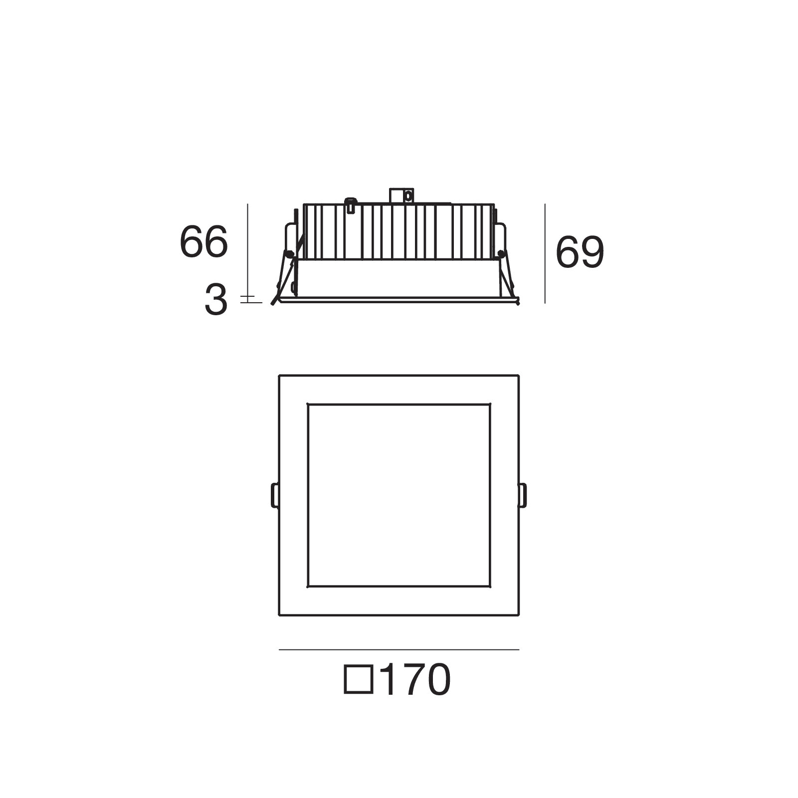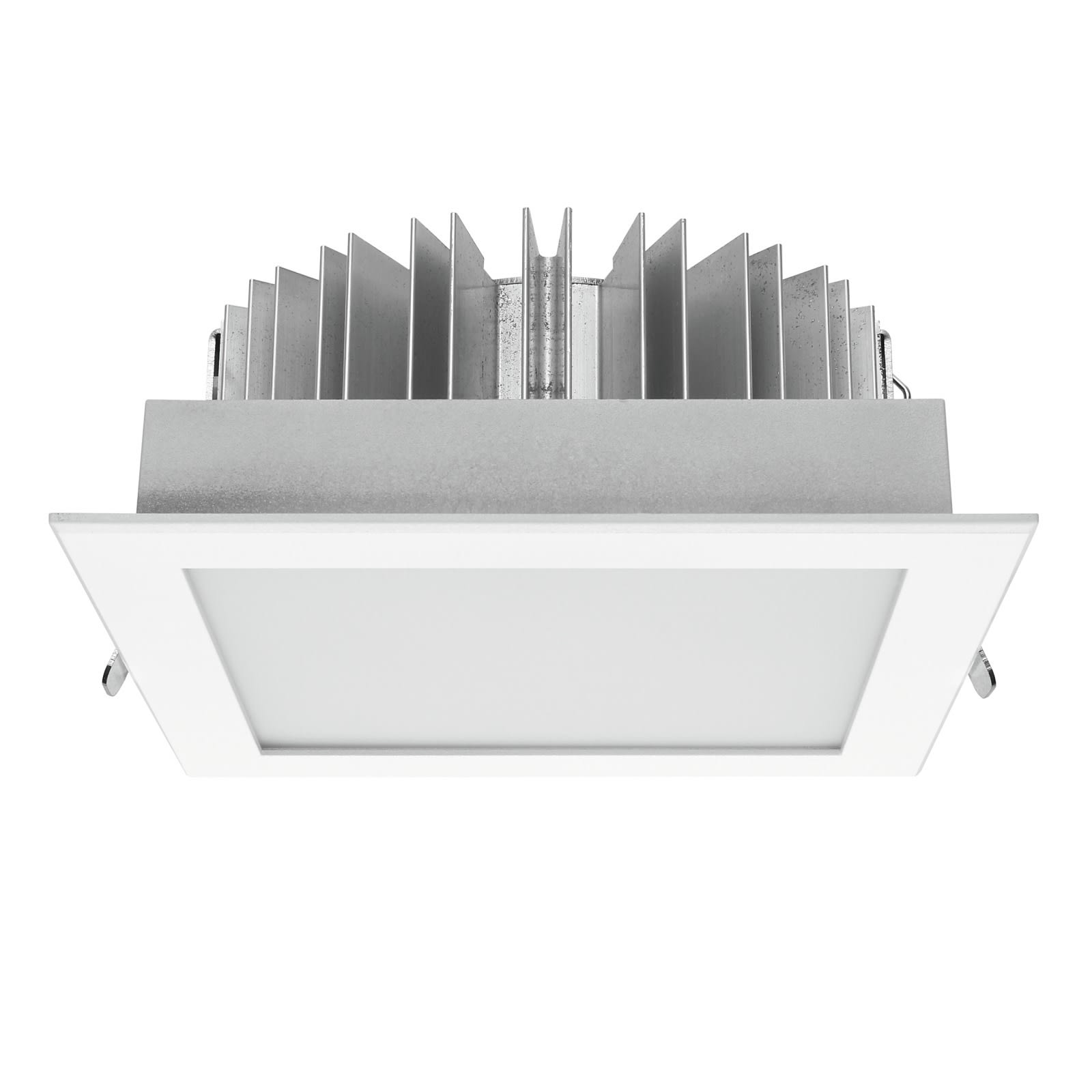 Downlights a singola emissione per applicazione indoor. La sorgente luminosa LED, di colore bianco naturale, con distribuzione luminosa General Lighting, è composta da 99 LED topled, con una CCT 4000 K ed un CRI 80; il flusso luminoso della sorgente èdi 2970 lm, con un'efficienza nominale di 129.1 lm/W.