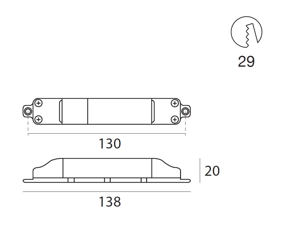 On/Off Driver 190~250V AC / 180~275V DC. Limitazione della corrente istantanea in uscita per protezione del LED all’accensione. Possibilità di inserire un interruttore lungo la linea in uscita. Protezione autoripristinante contro le sovratemperature, il sovraccarico, il circuito aperto ed il cortocircuito lungo la linea in uscita. Range: 0.6-1.4 W powerLEDs 220mA 6.6V.