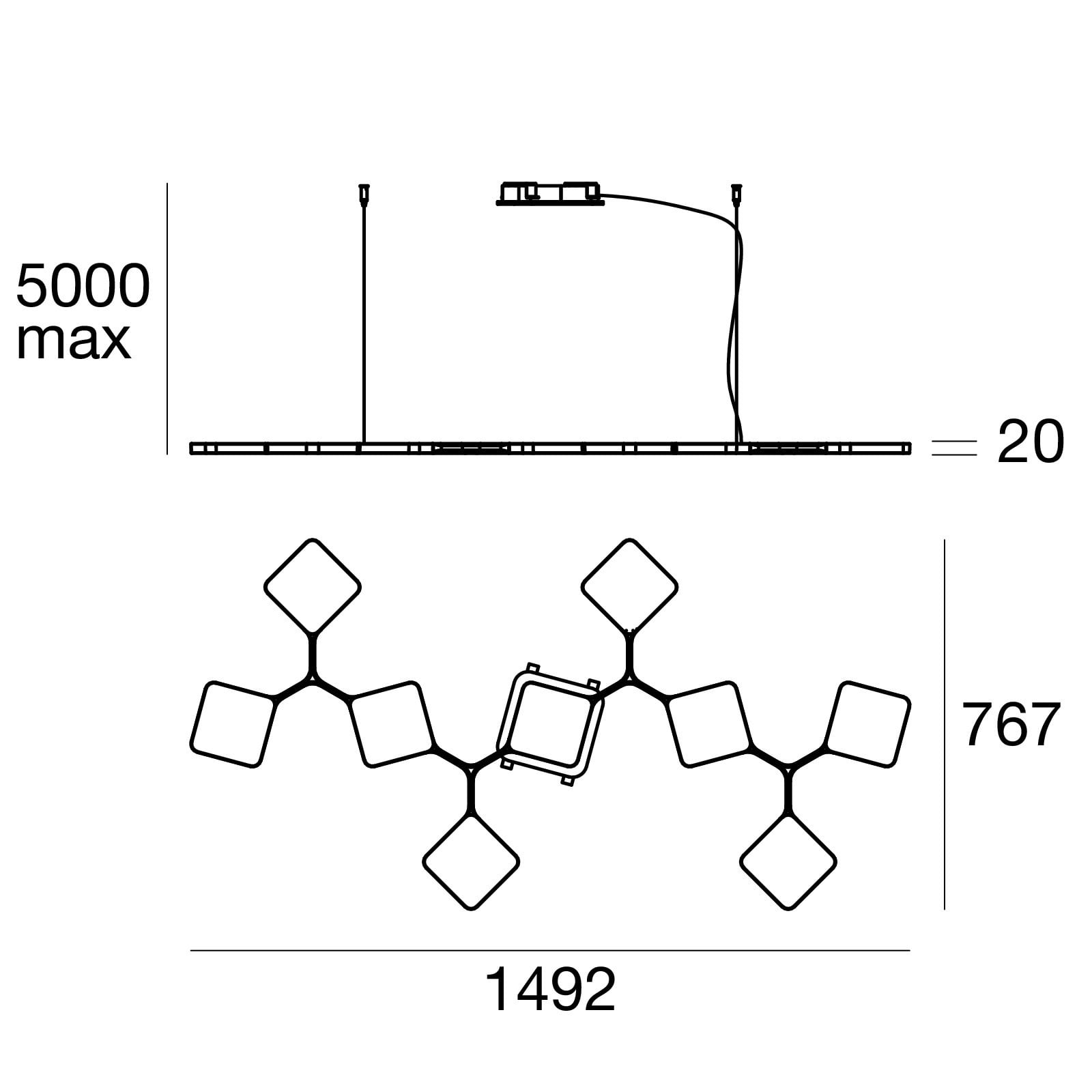 Sospensione a singola emissione per applicazione indoor. La sorgente luminosa LED, di colore bianco caldo, con distribuzione luminosa General Lighting, è composta da 108 LED topled, con una CCT 3000 K ed un CRI 90; il flusso luminoso della sorgente è di 9160 lm, con un'efficienza nominale di 114.4 lm/W ed una durata operativa (L80) di 80000 ore. Il corpo dell'apparecchio, realizzato in alluminio, presenta una finitura di colore bianco ral 9003 goffrato, ottenuta tramite verniciatura; il diffusore è prodotto in policarbonato; la montatura è prodotta in ferro, con una finitura di colore bianco ral 9003 goffrato, ottenuta tramite verniciatura. Il grado di protezione è IP40; Il driver di alimentazione è incluso nella confezione. La potenza assorbita dall'apparecchio è di 91 W, e viene fornita da un driver specifico con range operativo 220V - 240V / 60Hz - 50Hz. L'apparecchio presenta una classe di isolamento I ed è installabile a soffitto.