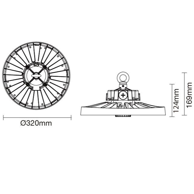 Kong, High Bay, ?320*169mm, ON/OFF, 200W, Dip-switch 2CCT 4000K/5000K, 30000LM, 150lm/W, UGR<31, 220-240V, IP66F, IK08, BA120, SDCM<5, -30?C~50?C, 100.000h L70B050, 5 anni di garanzia, Classe I, Nero, Lente PC + Alloggiamento in alluminio, 650?C GWT, PF 0.9, 50/60Hz, RG1, RA80, Cavo in gomma da 1,5 m senza spina, montaggio sospeso