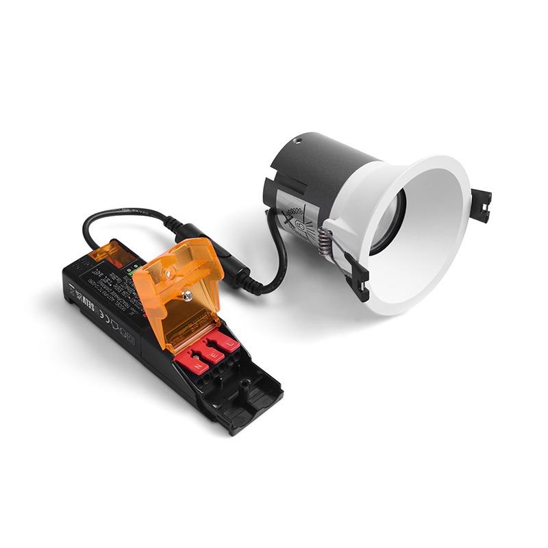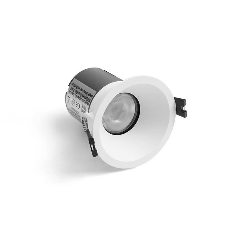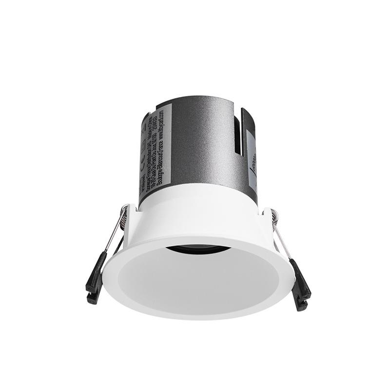 Faretto da incasso, Diametro 85*83mm, foro 75mm, non orientabile, Triac-dim, 7/12W, 3CCT 2700K/3000K/4000K, 700/1200lm, 100lm/w, 220-240V, IP44 anteriore/IP20 posteriore, IK02, BA38, UGR<19, -20~40℃, 50 000H (50 000hL70B50 per LED, 50 000h per driver), 5anni di garanzia, driver esterno, classe II, bianco (RAL9016, opaco), corpo in alluminio pressofuso + finiture in alluminio pressofuso + lente in PC, PF 0,9, 50/60Hz, cavo di uscita da 0,3M senza spina, con scatola di collegamento rapido, montaggio a incasso. Certificati:CE,RoHS,REACH,ERP