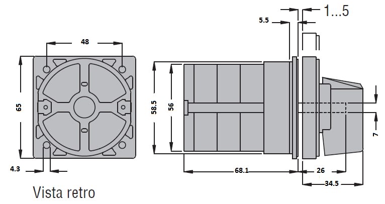 Invertitore tripolare per montaggio frontale. Elevata durata elettrica e meccanica. Contatti a doppia interruzione in lega d'argento. Apertura positiva dei contatti NC secondo le norme IEC/EN 60947-5-1. Grado di protezione IP40 (mostrina frontale), IP00 (contatti).