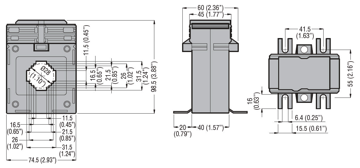 TRASFORMATORE DI CORRENTE, TIPO PASSANTE DI PRECISIONE, PER CAVO Ø28MM. PER BARRE DA 30X10MM, 25X15MM, 20X20MM, 250A.