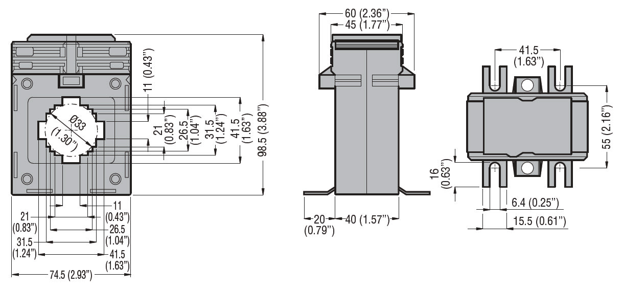 TRASFORMATORE DI CORRENTE, TIPO PASSANTE DI PRECISIONE, PER CAVO Ø28MM. PER BARRE DA 30X10MM, 25X15MM, 20X20MM, 500A.