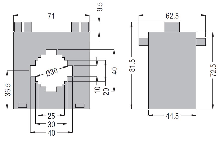 Trasformatore di corrente tipo passante, per cavo Ø 30 mm e barre da 40x10 mm, 30x20 mm, 25x25 mm. I trasformatori di corrente serie DM vengono montati in un sistema elettrico per ridurre la corrente di linea ad un valore secondario di 5A compatibile congli ingressi amperometrici dei multimetri digitali o dei relè di protezione. Sono trasformatori di corrente senza avvolgimento primario e vengono normalmente utilizzati per alti valori di corrente primaria. Il numero di passaggi del cavo primario non modifica le caratteristiche di precisione, ma riduce il valore della corrente primaria a parità di corrente secondaria.