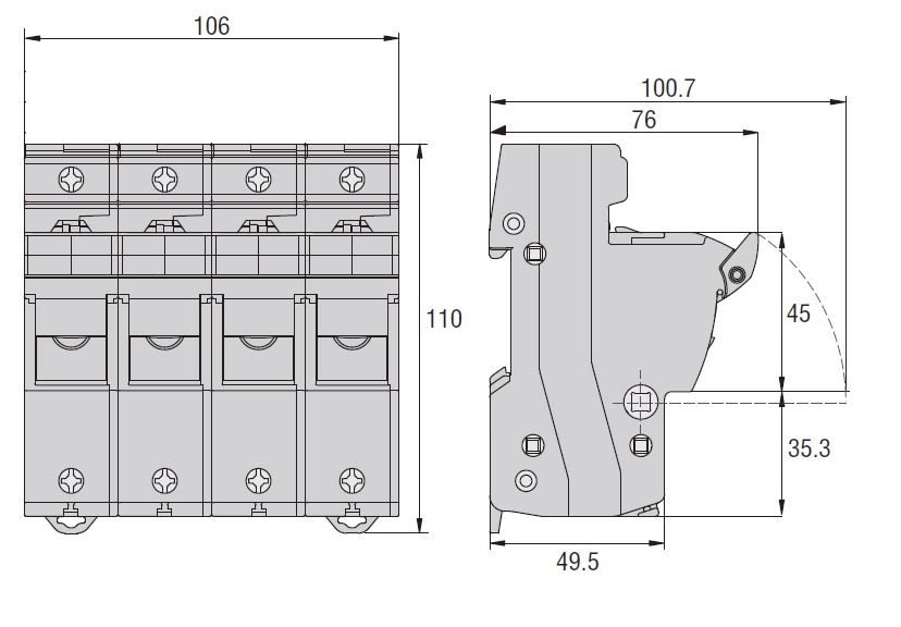 BASE PORTAFUSIBILI OMOLOGATA CURUS, PER FUSIBILI 14X51MM. CORRENTE NOMINALE 50A (690VAC), 3P+N. SENZA INDICATORE LUMINOSO. 4 MODULI