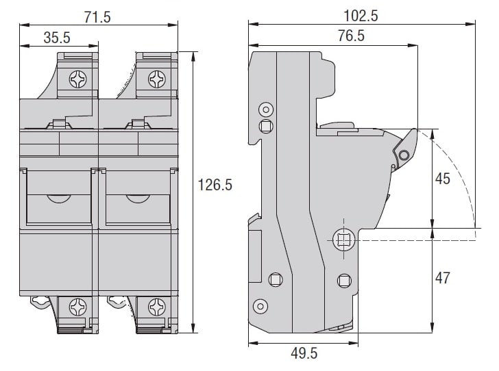 BASE PORTAFUSIBILI OMOLOGATA CURUS, PER FUSIBILI 22X58MM. CORRENTE NOMINALE 125A (690VAC), 2P. SENZA INDICATORE LUMINOSO. 2 MODULI
