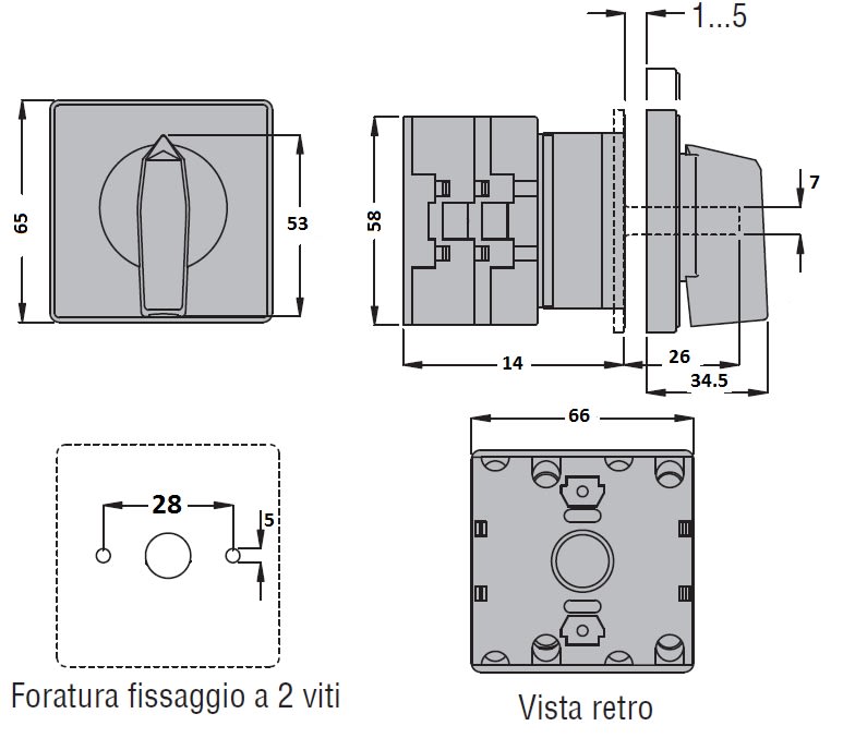Interruttore quadripolare per montaggio frontale. Elevata durata elettrica e meccanica. Contatti a doppia interruzione in lega d'argento. Apertura positiva dei contatti NC secondo le norme IEC/EN 60947-5-1. Grado di protezione IP65 (mostrina frontale), IP20 (contatti).
