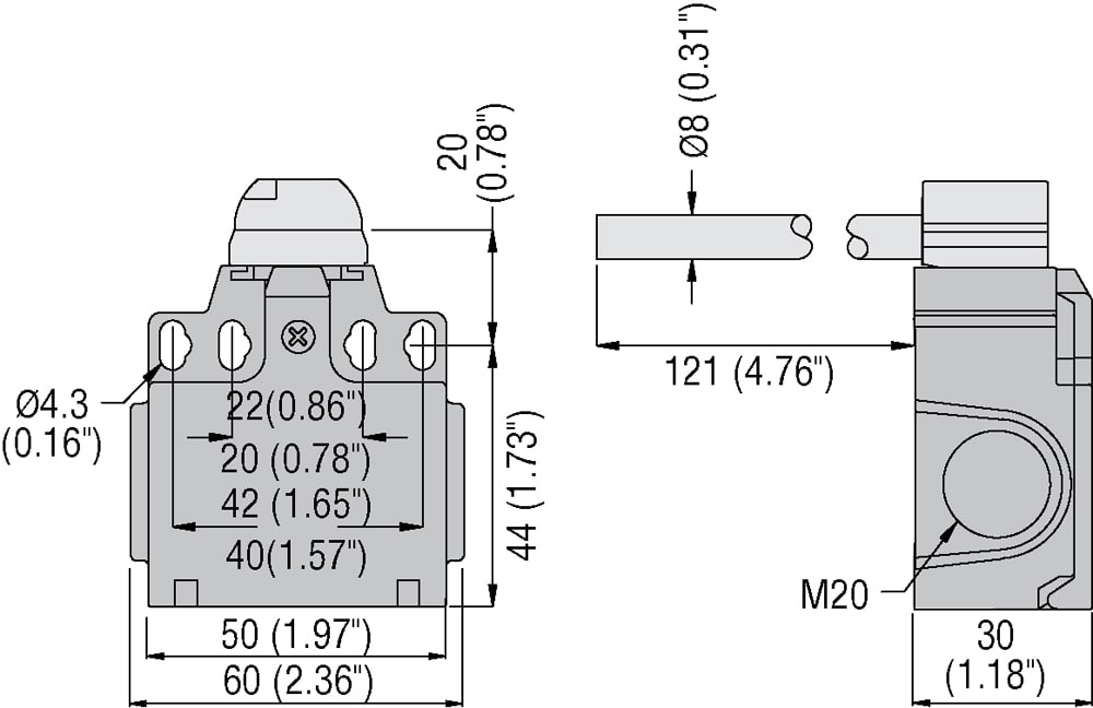 FINECORSA SERIE K, A CERNIERA, 2 INGRESSI LATERALI PER CAVI. DIMENSIONI COMPATIBILI EN 50047, CUSTODIA PLASTICA, CONTATTI 1NA+1NC LENTO. ALBERO PIENO LUNGO CON RIBASSO
