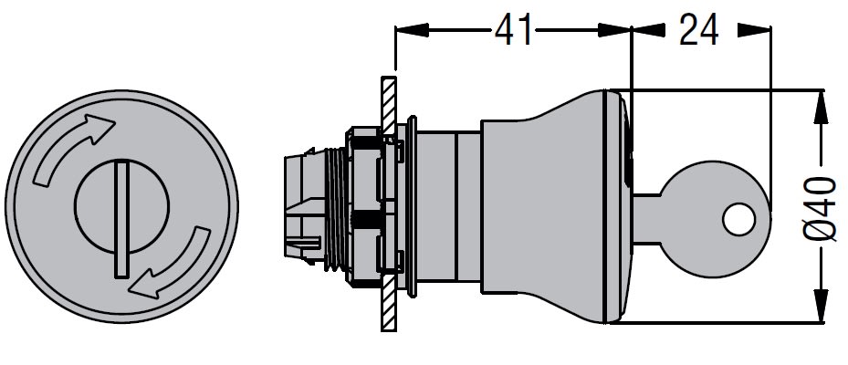 Pulsante a fungo Ø40mm ad aggancio con sgancio a chiave, per arresto d'emergenza conforme ISO 13850. E' ammessa qualsiasi posizione di montaggio, realizzato in poliammide. Si aggancia su foro Ø 22mm mediante ghiera filettata. Durata meccanica: 300.000 cicli