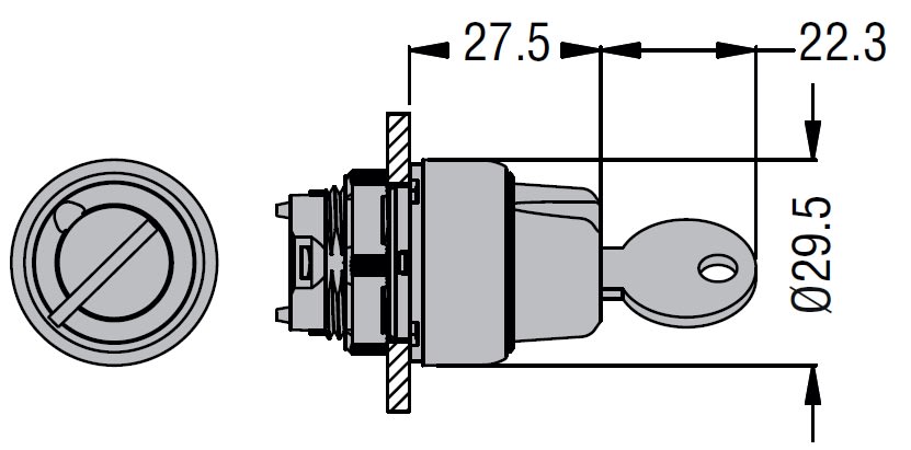 Selettore a chiave a 2 posizioni, è ammessa qualsiasi posizione di montaggio, realizzato in poliammide. Si aggancia su foro Ø 22mm mediante ghiera filettata. Durata meccanica: 1.000.000 cicli