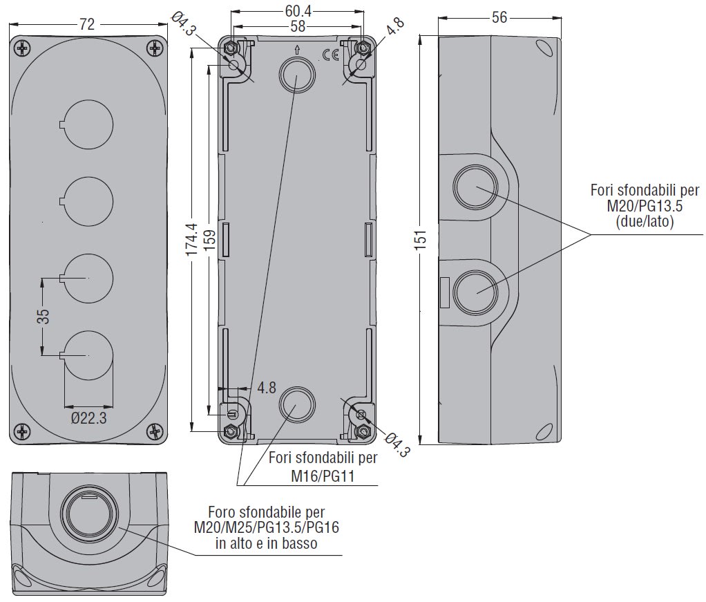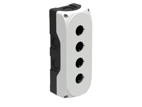 Pulsantiera senza operatori in policarbonato, dimensioni compatte, facilità di cablaggio con utilizzo di contatti e di portalampade con montaggio sul fondo; possibile utilizzo di contatti e portalampade con attacchi a vite o a molla fissati all'interno del coperchio tramite la base di fissaggio LPX AU120.