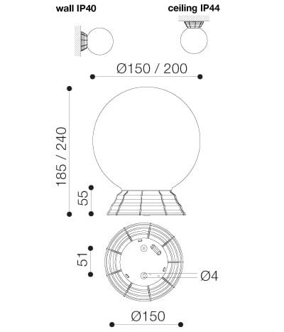 Apparecchio per esterni: Apparecchio per utilizzo a parete o soffitto completo di diffusore sferico Ø200mm. Colore: Nero-Bianco. Utilizzo: Parete (IP 40). Soffitto (IP 43). Caratteristiche peculiari: Economicità. Caratteristiche tecniche: Corpo in tecnopolimero rinforzato. Diffusore sferico in acrilico bianco. Viteria in acciaio inox.
