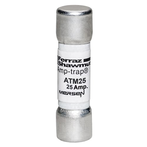 I fusibili Amp-Trap? ATM Midget ad azione rapida hanno una tensione nominale c.c. e c.a. di 600 volt e un potere di interruzione di 100kA. Questi valori consentono di utilizzare i fusibili ATM in diverse applicazioni non coperte da altri fusibili Midget.Inoltre, sono disponibili portate amperometriche di 30/35, 30/40 e 30/50 ampere per applicazioni specifiche, come la protezione dei condensatori. Questi fusibili ATM devono essere considerati come fusibili da 30A per le loro dimensioni, ma sono in grado di resistere a correnti di spunto molto piu alte e a cicli di lavoro piu impegnativi. (Non destinati alla protezione dei circuiti derivati.)