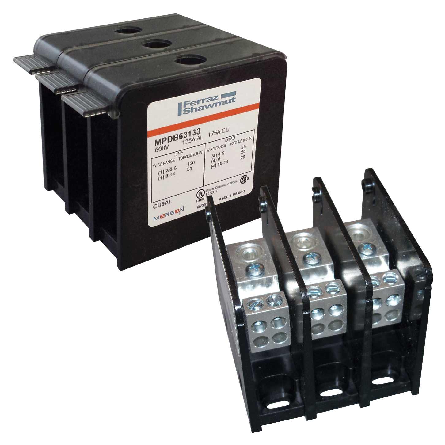 Il blocco di distribuzione (PDB) di prossima generazione. I blocchi di distribuzione Mersen offrono un modo facile e sicuro per separare i cavi, dividere la potenza primaria in circuiti secondari e soddisfare le richieste per punti di presa a raccordo fisso. Tutti i blocchi sono approvati UL e CSA e soddisfano i requisiti della norma UL508A e del National Electrical Code? in merito al distanziamento dei circuiti di alimentazione e di derivazione. Le opzioni PDB includono ingressi primari a conduttore semplice o doppio e fino a 30 uscite secondarie. Sono disponibili dei blocchi speciali che consentono fino a 7 ingressi primari. La serie MPDB e proposta in tre grandezze: miniaturizzata (serie MPDB62 e MPDB63), intermedia (serie MPDB66 e MPDB67) e grande (serie MPDB68 e MPDB69), in allumino e in rame.