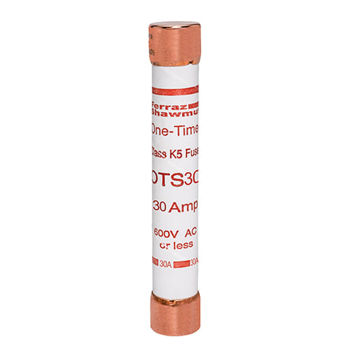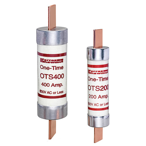 I fusibili per uso generico OTS (One-Time) offrono una protezione a costi contenuti per alimentatori e circuiti derivati nel campo dellilluminazione, del riscaldamento e di altri carichi non motorizzati. I fusibili OTS interromperanno in tutta sicurezza le correnti di corto circuito fino a 50.000 ampere. Questi fusibili non prevedono alcun sistema di reiezione, per cui occorrera prestare la massima attenzione per evitare di sostituirli con fusibili con un potere di interruzione inferiore.