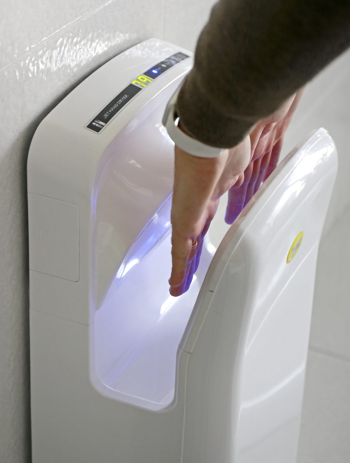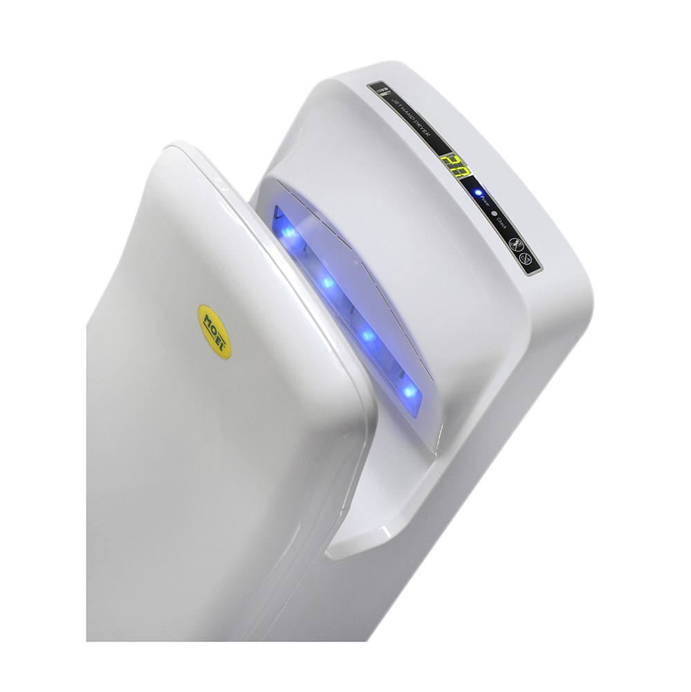 ASCIUGAMANI A LAMA D’ARIA Gli asciugamani a lama d’aria sono l’avanguardia dei dispositivi igienici: estremamente veloci consentono un notevole risparmio di energia e la pratica vaschetta raccogli-goccia impedisce lo sgocciolamento a pavimento. Twist è un modello dallo straordinario rapporto qualità / prezzo. Il doppio motore e i 42 fori di uscita bidirezionali assicurano all’utente un eccellente performance di asciugatura. Potenza: 1900 W e resistenza escludibile. Display luminoso e termometro digitale che misura la temperatura ambiente. DOTATO DI TERMOMETRO AMBIENTE E DI FILTRO ANTIPOLVERE. Una raffinata elettronica lo protegge da atti vandalici e agenti esterni. Colore bianco. Raccomandato per: La vasca raccogli gocce ne garantisce l’igiene e lorende adatto a luoghi pubblici, come hotel, ristoranti scuole e ospedali.