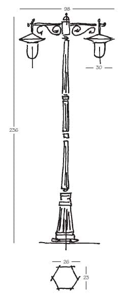 Pressofusione di alluminio. Diffusore: Policarbonato Trasparente, Opale (versione standard). Specifiche elettriche: 23W E27, 60W E27.