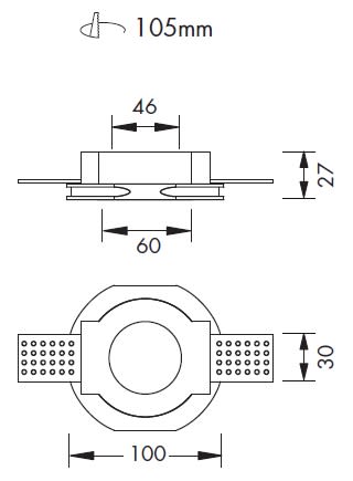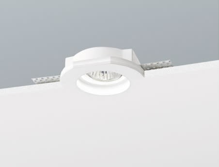 Cornice tonda in gesso, completa di alette per il fissaggio al cartongesso, con dimensioni variabili da 6 a 15mm di spessore. Emissione fissa. Incasso a scomparsa totale. IP20. Completo di portalampada GU10, compatibile con lampada LED max 8W, non inclusa. Dimensioni: diametro 100mm, altezza 31mm. Modulo LED IP64 compatibile, da ordinare separatamente.