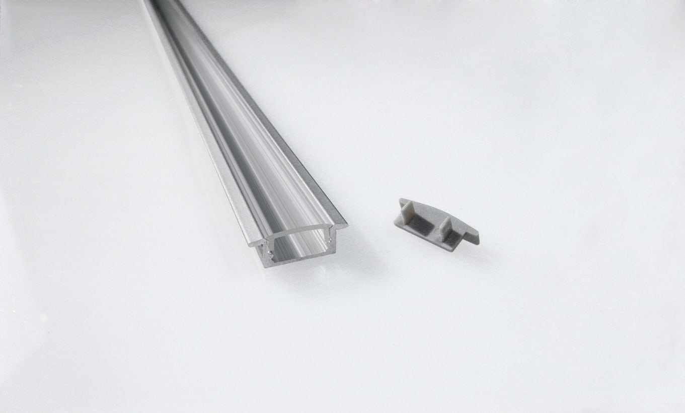 Profilo in alluminio da incasso per striscia LED con diffusore trasparentedi 2m. Tappi (4 pz) inclusi. Forare il profilo per il fissaggio.