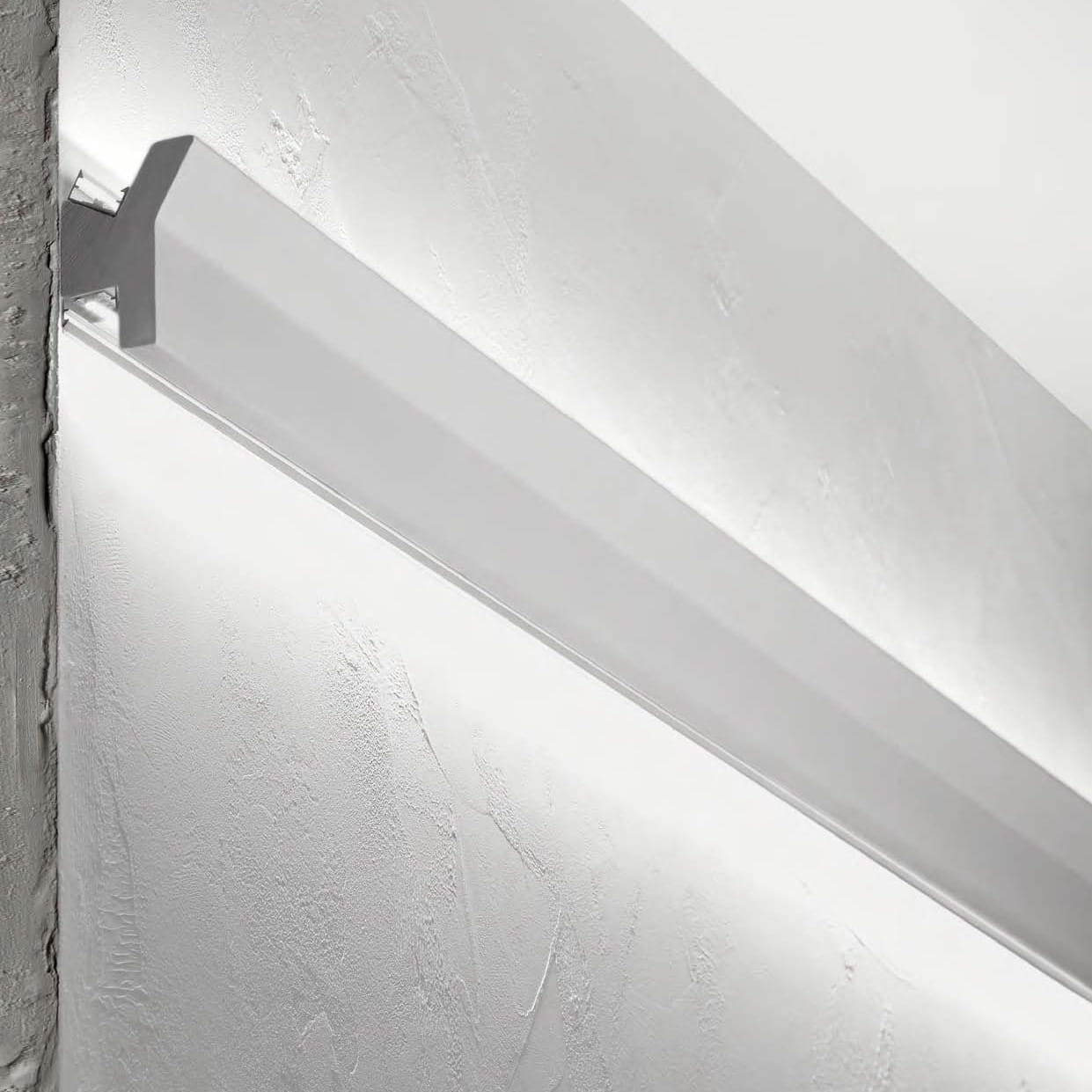 Profilo prefinito in gesso, per installazione a parete, effetto bi-emissione. Elemento completo di due barre in alluminio per applicare fino a due strisce LED. Chiusure laterali da effettuare durante il montaggio.