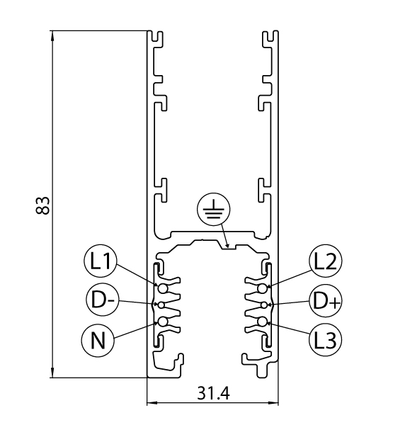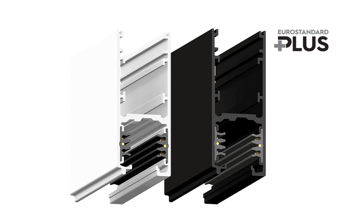 Binario elettrificato trifase (tensione di rete 230/250V - 16A) a 6 conduttori: 4 per modalità trifase, 2 per la gestione di un qualsiasi segnale (es. dali, dmx, lon, eib, ecc). Lunghezza 3m. Il sistema formato da n. 3 conduttori di fase + neutro permette di ottenere n.3 circuiti distinti per n.3 accensioni separate. Rete trifase: carico complessivo di 16A (10500VA), DALI 2X1A (100VA). Rete monofase: carico massimo di 16A (3500VA), DALI 2x1A. Possibilità di utilizzare lo spazio superiore per l'installazione di una strip LED per l'illuminazione indiretta. Accessori da ordinare separatamente. Normativa: EN 60570.