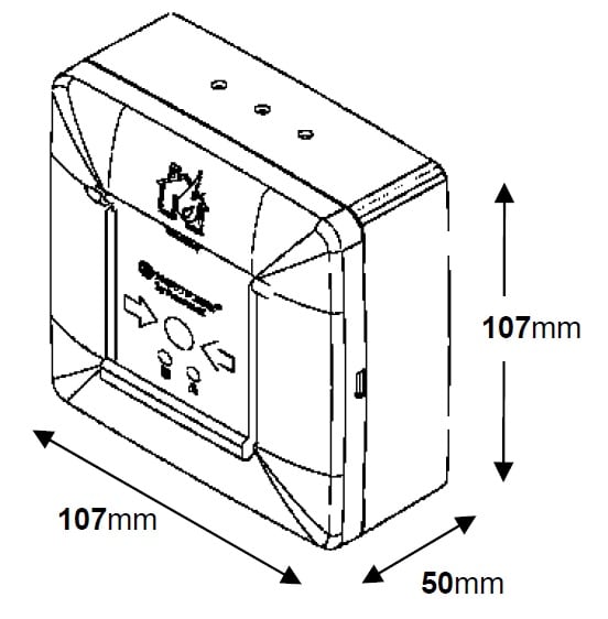 Pulsante indirizzato manuale da interno a rottura vetro. Provvisto di doppio led rosso per la segnalazione locale di allarme e di corto circuito. Indirizzamento a mezzo di selettori rotanti con numerazione da 01 a 99 e provvisto di doppio isolatore per protezione della linea di comunicazione. Fornito con chiave di test. Certificato CPD in accordo alla Normativa EN54 parte 11. Alimentazione 15-28Vcc. Corrente a riposo di 560 microA ed in allarme di 5mA con led attivo. Temperatura di funzionamento da 0°C a+50°C. Umidità relativa sino a 93%. Grado di protezione IP30. Dimensioni: 107 x 107 x 50.