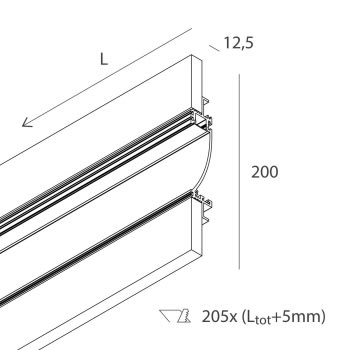 Profilo lineare per Strip LED tagliabile in opera, per realizzare linee di luce asimmetrica. Installabile su parete di cartongesso a doppia lastra, o in controsoffitto su lastra singola. Installabile su muratura solo rivestita con doppia lastra di cartongesso. Corpo in cartongesso di spessore 12,5 mm da lastra HYDRO (a ridotto assorbimento di acqua, utilizzabile in ambienti con umidit? relativa costante dell?aria ?70%). Profilo dissipante in lega di alluminio verniciato bianco e schermo di protezione inPMMA opale inclusi. Testate terminali, kit di giunzione, Strip LED e alimentatore elettronico 24Vdc remoto da ordinare a parte.