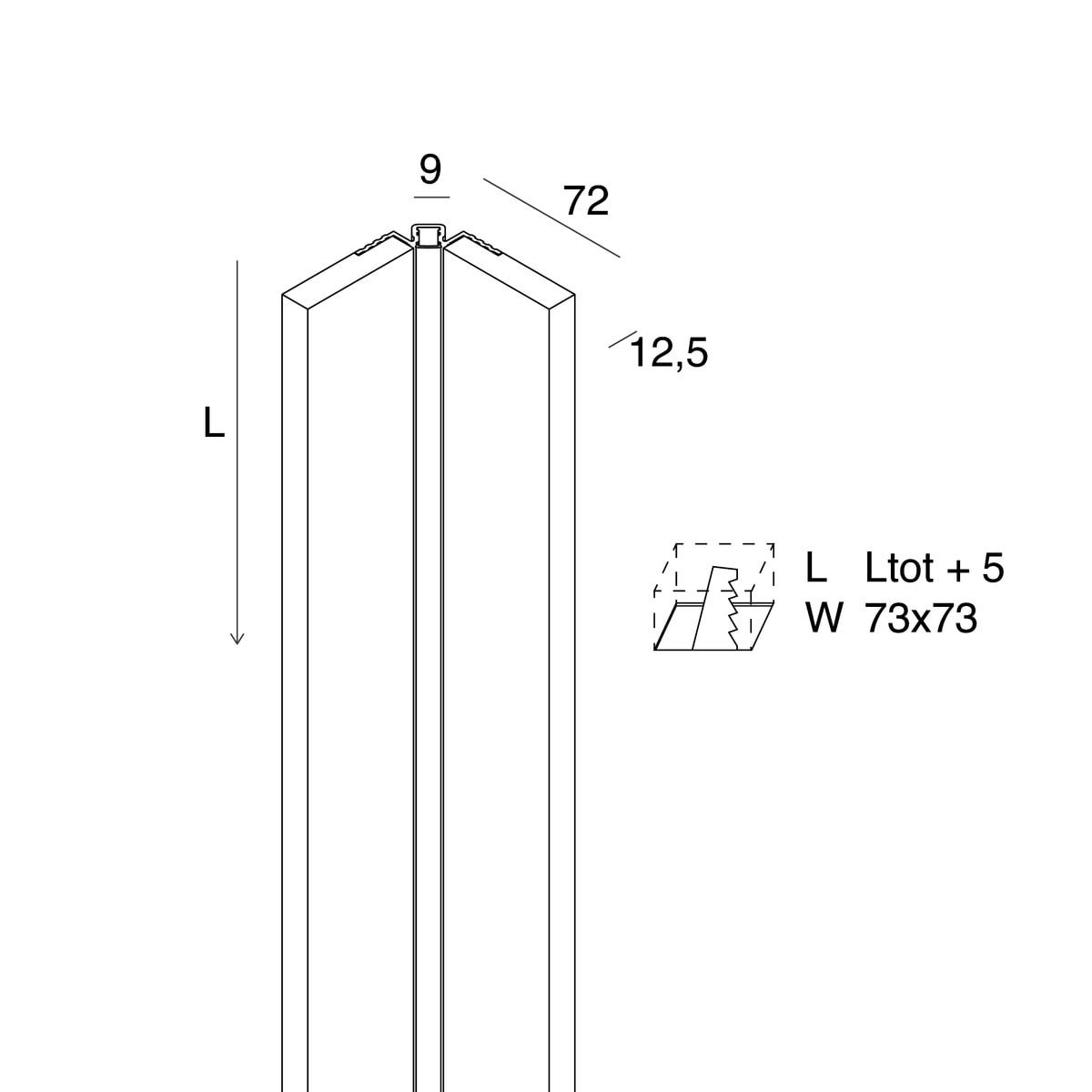 L-09 CORNER profilo lineare per spigolo esterno non installabile direttamente su muratura, per realizzare linee di luce incassate nel cartongesso. Corpo in cartongesso di spessore 12,5 mm da lastra standard. Profilo dissipante in lega di alluminio anodizzato naturale e schermo di protezione in PMMA opale inclusi. Strip LED e alimentatore elettronico 24Vdc remoto da ordinare a parte. Non esporre a intemperie o luce solare diretta e non inserire in materiale isolante.