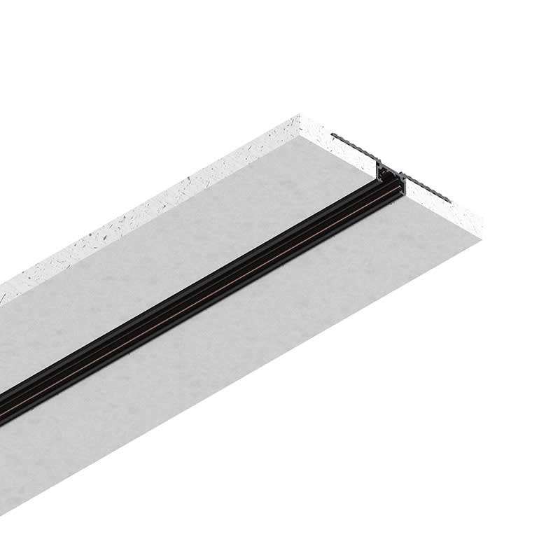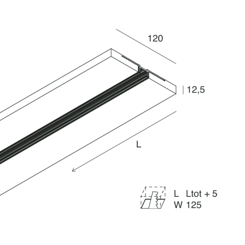 PROFILO LINEARE Sistema in cartongesso con binario elettrificato 48V integrato, tagliabile in opera. Compatibile con proiettore Mir 48V e moduli LED lineari 48V con micro ottiche. Corpo in cartongesso di spessore 12,5 mm da lastra standard e binario elettrificato a bassa tensione (48V) ad un circuito max 10A 0-60Vdc + D+/D- (per segnale DALI), in lega di alluminio estruso verniciato nero RAL9005 goffrato. Estruso isolante in PVC per conduttori in rame. Nel caso di taglio dei binari ed inserimento in filacontinua con alimentazioni diverse ? obbligatorio l?isolamento elettrico tra gli spezzoni, tramite l?utilizzo di una testata terminale. Gestione ON/OFF con alimentatore stabilizzato 48V, e DALI con alimentatore 48V, optoisolatore e opportuna centralina DALI o con interfaccia pulsante 18908.99 (da ordinare a parte). Sistema installabile in continuit? con L-16 Evo.