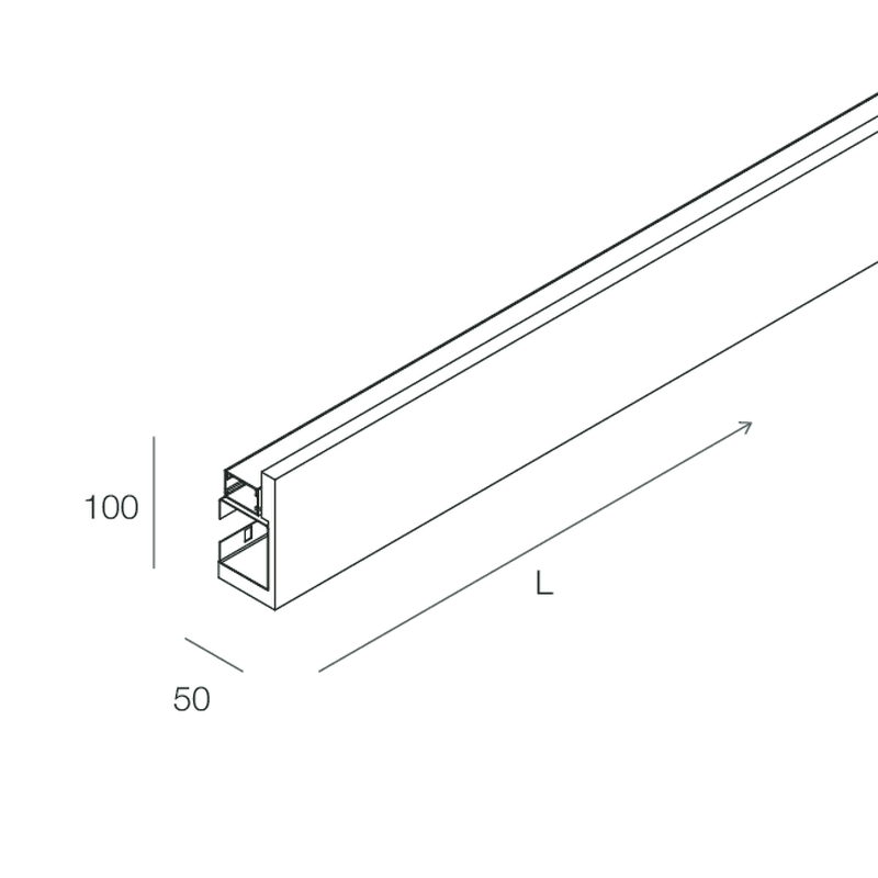 Profilo per Strip LED tagliabile in opera per installazione a parete. Corpo e testate terminali in cartongesso, profilo dissipante in lega di alluminio anodizzata naturale. Staffe per installazione a parete in lamiera di acciaio zincata, schermo di protezione in PMMA opale. Strip LED, testate di chiusura ed alimentatore elettronico 24Vdc da ordinare a parte.