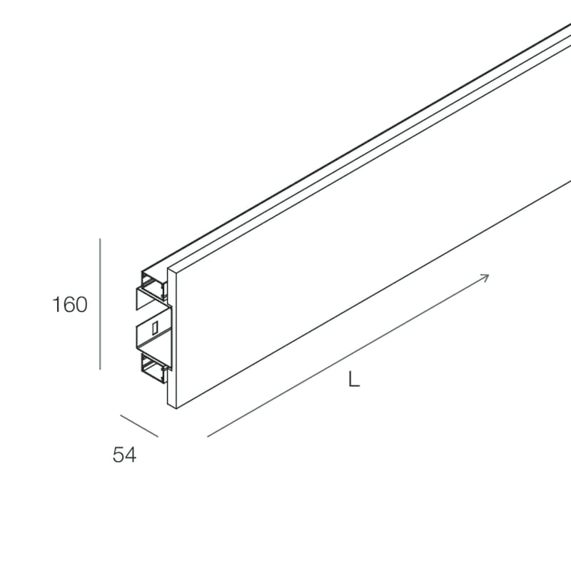 Profilo per Strip LED tagliabile in opera per installazione a parete. Corpo e testate terminali in cartongesso, profilo dissipante in lega di alluminio anodizzata naturale. Staffe per installazione a parete in lamiera di acciaio zincata, schermo di protezione in PMMA opale. Strip LED, testate di chiusura ed alimentatore elettronico 24Vdc da ordinare a parte.