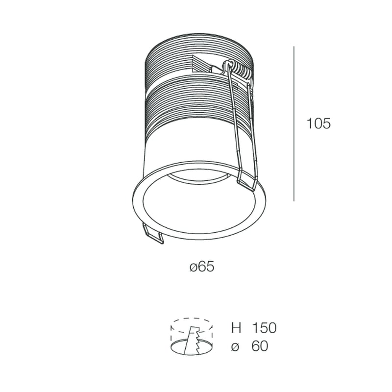 Downlight LED per incasso in cartongesso. Corpo e dissipatore in lega di alluminio verniciata. Molle in acciaio armonico per fissaggio su controsoffitto. Alimentatore elettronico da ordinare a parte.