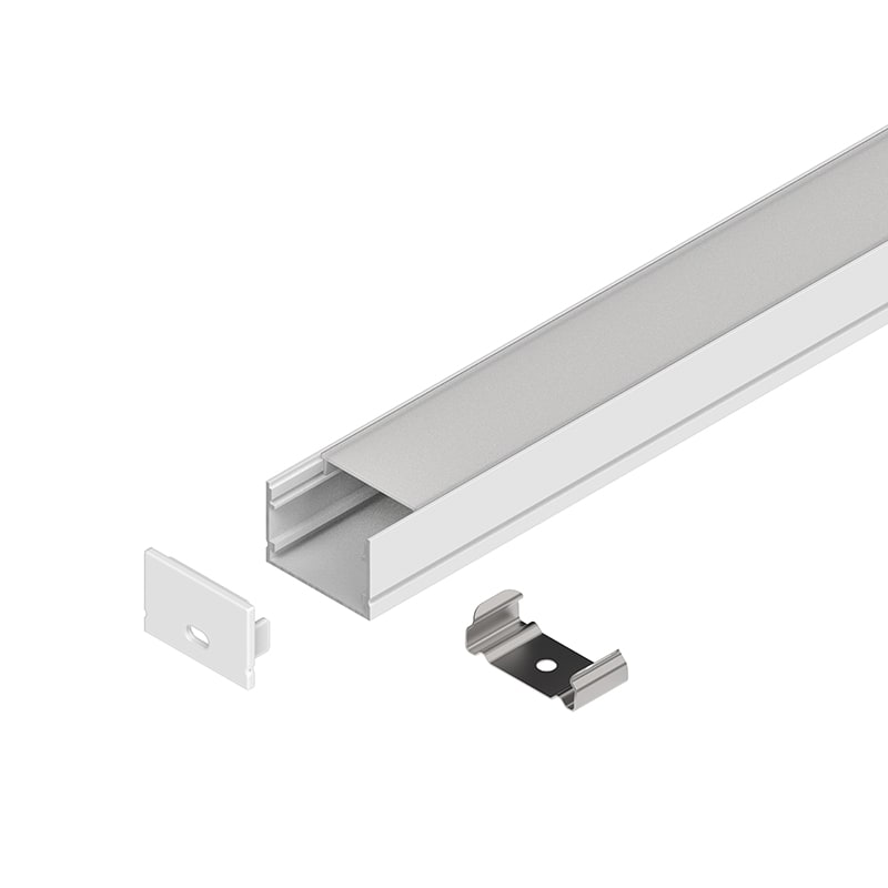 PROFILED MACRO :Profilo dissipante per Strip LED doppia pista 25W/m, in lega di alluminio anodizzato naturale o verniciata bianca, testate di chiusura in polimero termoplastico, schermo diffusore ad inserimento a scatto in PC opale. Schermo diffusore, testate di chiusura e 4 staffe di fissaggio inclusi. Strip LED e alimentatore 24Vdc da ordinare a parte. Non esporre a intemperie o luce solare diretta e non inserire in materiale isolante.