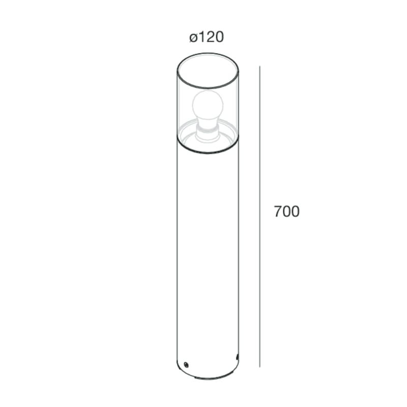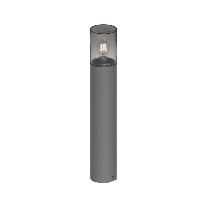 Bollard LED IP65, E27 a tensione di rete, per istallazione su pavimentazione. Corpo in lega di alluminio. Verniciatura a polvere grigio antracite ad alta resistenza agli agenti atmosferici. Schermo diffusore in vetro nelle versioni fum? o ambra. SorgenteLED E27 non inclusa.