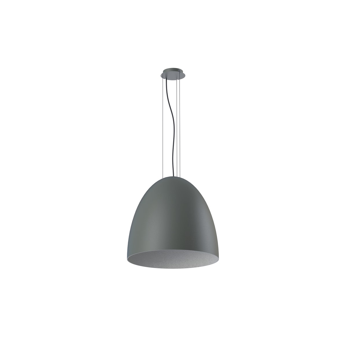 CALIMERO Sospensioni a luce diretta in materiale composito verniciato grigio chiaro o grigio scuro, con schermo diffondente arretrato. Sospensioni in Kevlar e cavo di alimentazione con rotezione in treccia neri.