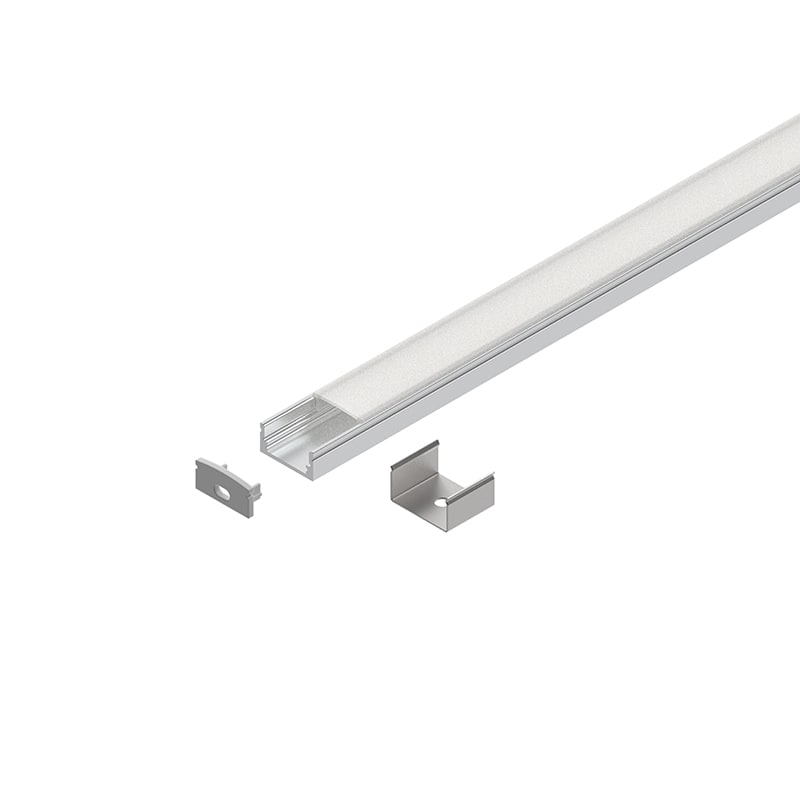 Profilo dissipante per Strip LED in lega di alluminio anodizzato naturale, testate di chiusura in polimero termoplastico, schermo diffusore ad inserimento a scatto in PMMA opale. Schermo diffusore, testate di chiusura e n?4 staffe di fissaggio inclusi. Strip LED e alimentatore 24Vdc da ordinare a parte. Non esporre a intemperie o luce solare diretta e non inserire in materiale isolante.