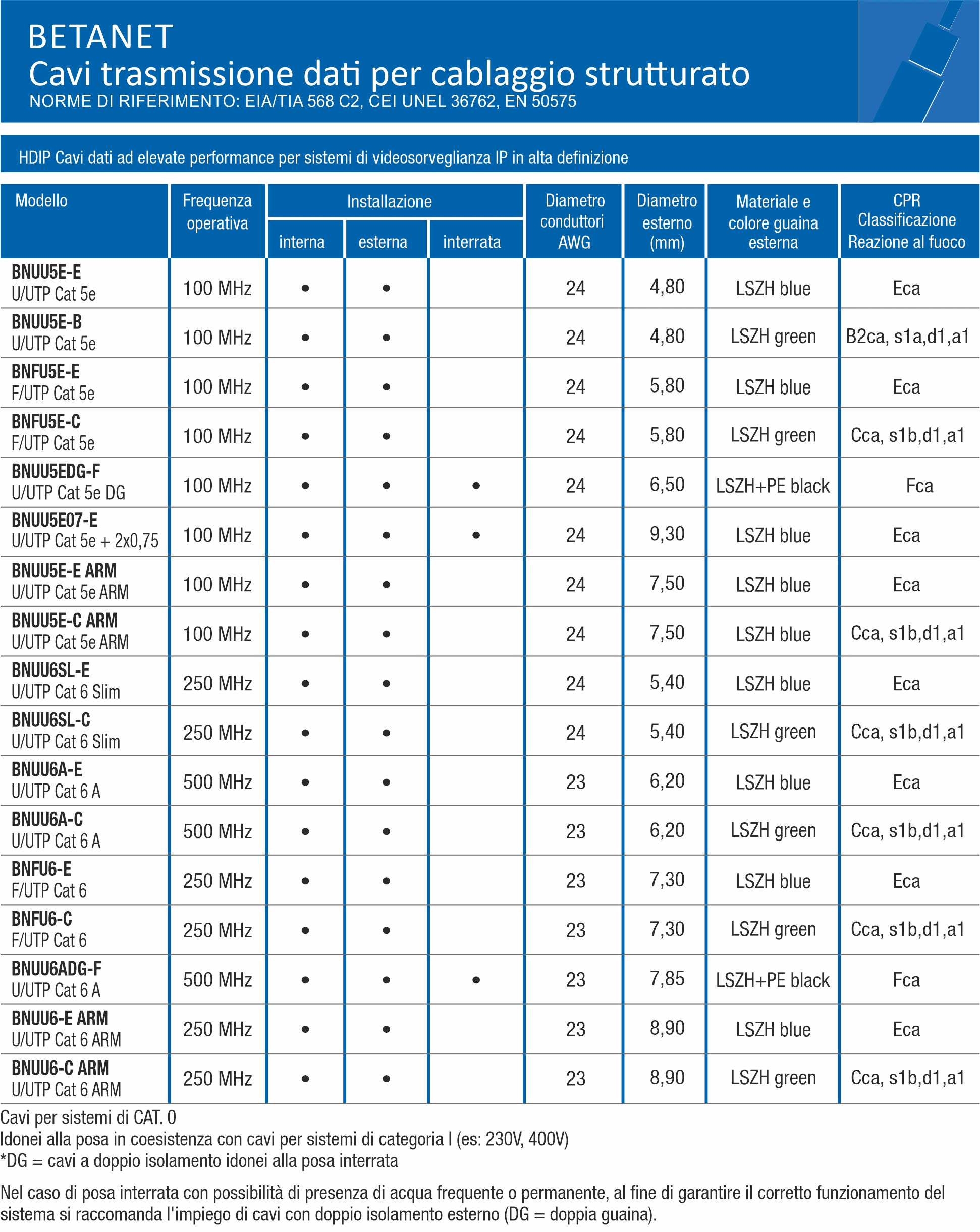 BETANET - BNFU5E E NH Cavo trasmissione dati per cablaggio strutturato idoneo alla posa in coesistenza con cavi energia 230V 400V. Realizzato con conduttori in rame, guaina in Duraflam LSZH. Categoria 5E Euroclasse Eca Imballo: bobina di legno da 1000m