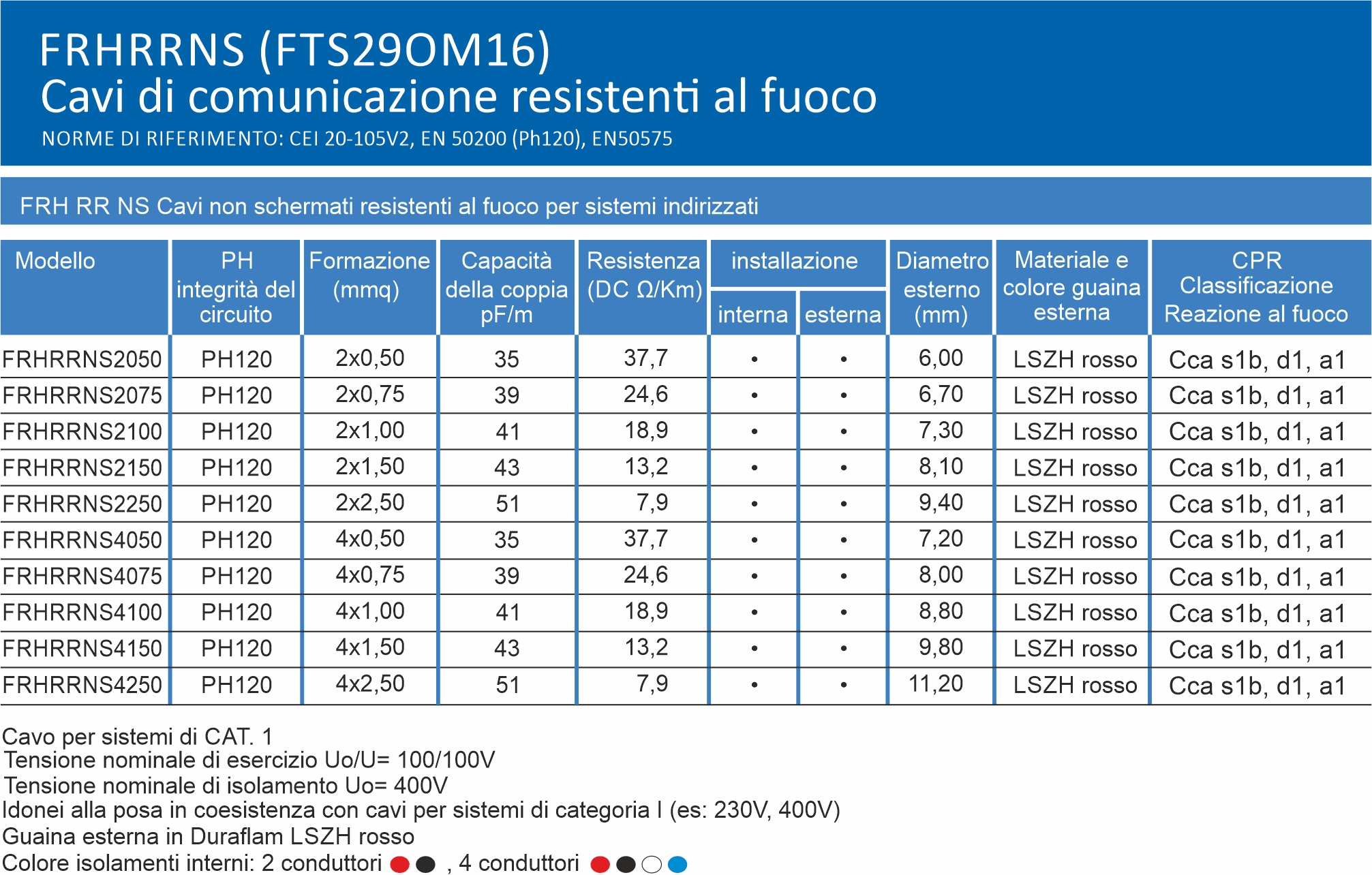 FRHRR NS C NH Cavo per sistemi di rivelazione incendio indirizzati resistente al fuoco (PH 120) idoneo alla posa in coesistenza con cavi energia 230V 400V. Realizzato con conduttori in rame, guaina in Duraflam LSZH, idoneo alla posa in ambienti umidi ebagnati. Euroclasse Cca s1b d1 a1 Formazione: 2x0,50 Imballo: matassa in termoretraibile da 100m