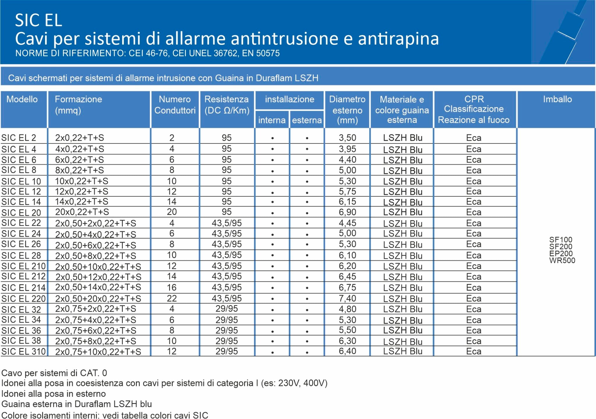 SIC E NH Cavo per sistemi antintrusione idoneo alla posa in coesistenza con cavi energia 230V 400V . Realizzato con conduttori in rame, guaina in Duraflam LSZH idonea alla posa in interno. Euroclasse Eca Formazioni disponibile: 2x0,50 + 4x0,22 + T + S