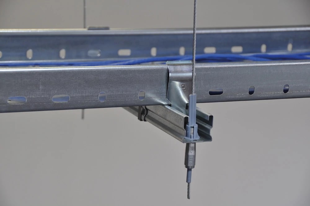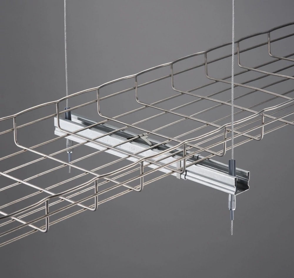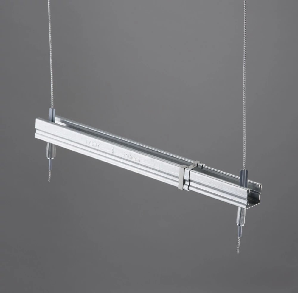 Soluzione pronta all'uso composta da un profilo Strut Telescopico, due cavi con terminale a gancio e due meccanismi di bloccaggio. Si allunga alla lunghezza desiderata ed è fissato in posizione semplicemente premendo un clip di bloccaggio. La sezione continua del profilo strut Telescopico permette il montaggio di qualsiasi accessorio standard per profili Strut in qualunque posizione tra i due cavi di sostegno. Supporta fino a sette conduits 2" (50 DN) , sei tubi riempiti con acqua da 2" (50 DN) con 3 m di interspaziatura, o canale portacavi fino a 450 mm di larghezza. Conduit e tubi possono posizionati direttamente sul profilo strut, risparmiando spazio verticale in edifici con limitato spazio per l'installazione. Si fissa alla struttura dell'edificio o all'oggetto da sospendere avvolgendo il cavo ed assicurandolo con il gancio. Si aggancia ad una vasta gamma di fissaggi nVent CADDY. La chiusura di sicurezza del sistema di bloccaggio viene fatta semplicemente con le dita senza ausilio