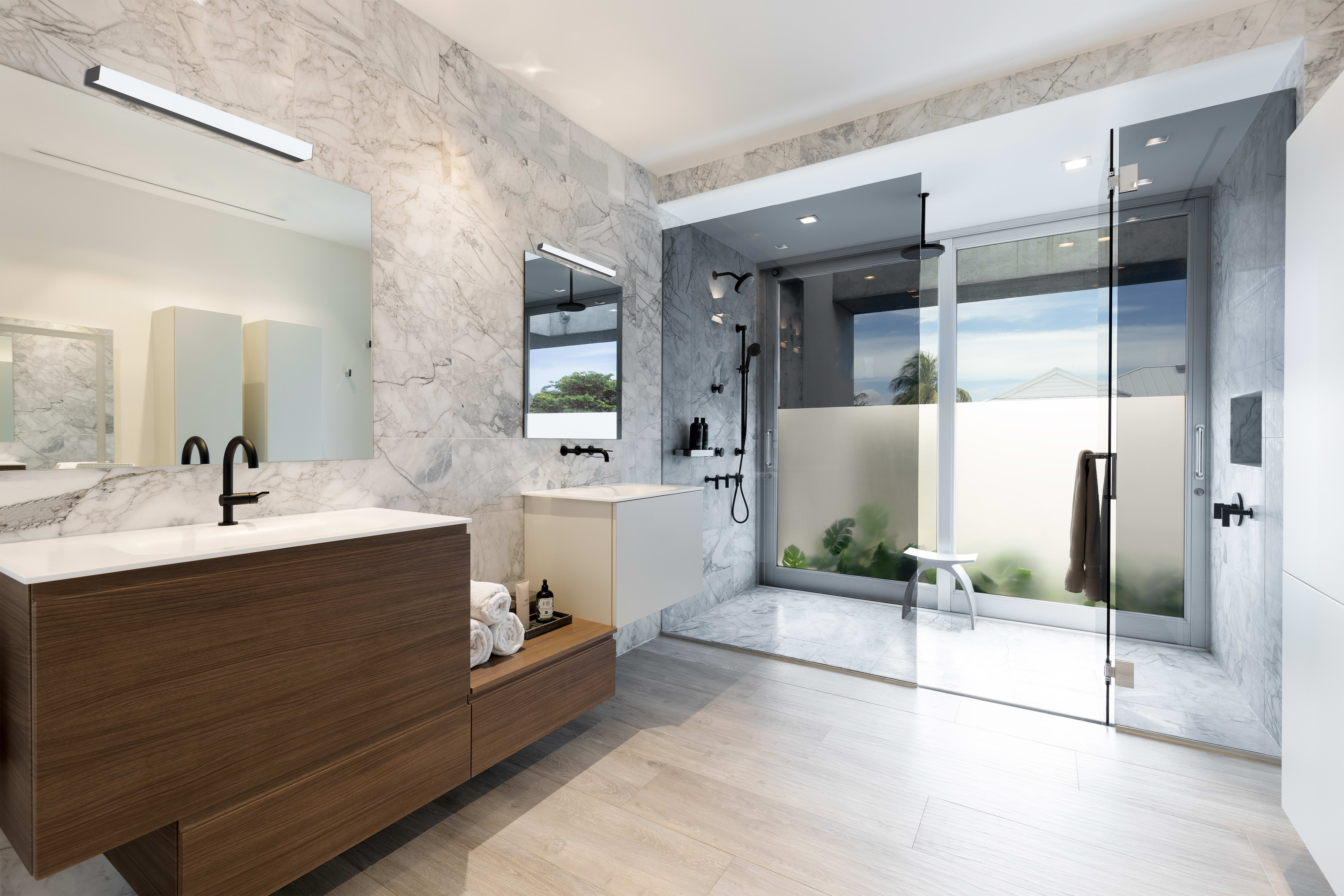 Apparecchio decorativo a parete dal design minimalista. Stagno IP44 adatto a bagni e spazi analoghi. Eccellente uniformità della luce. Interruttore CCT integrato per la selezione della temperatura di colore (3000K-4000K).